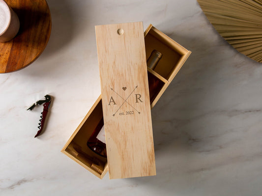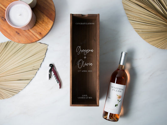 Wood Wine Box (Design 1) - Congratulations - Walnut Pine Wine Champagne Box, Engagement Wedding Gift for the Bride & Groom Honeymoon Gift CP