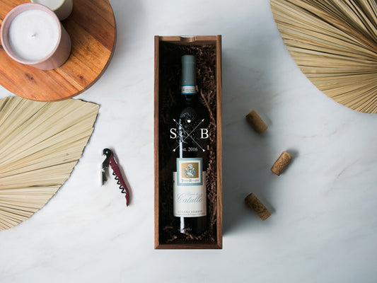 Wood Wine Box (Design 2) - Walnut Wood Port Wine Champagne Box, Engagement Wedding Anniversary Gift for Bride & Groom Couples Honeymoon Gift