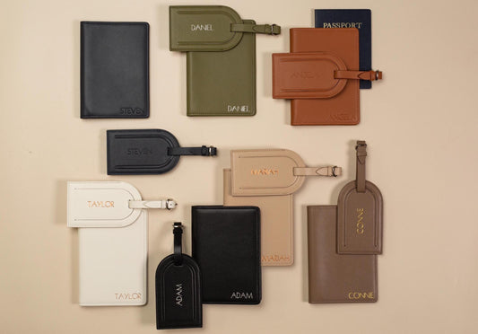 Embossed Leather Passport Holder & Embossed Luggage Tag (SET) - Travel Card Wallet, 3rd Wedding Anniversary Gift, Custom Gift for Family