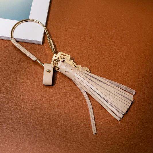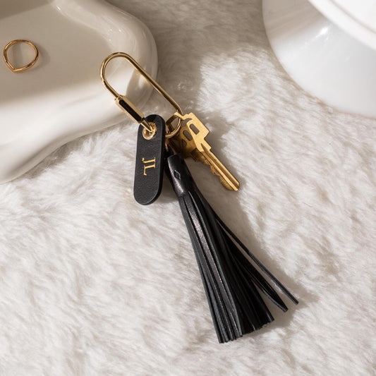 Embossed Leather Tag Keychain w/ Tassel - modern key rings, custom monogrammed zipper pull, mini personalized key chain gift, gold carabiner