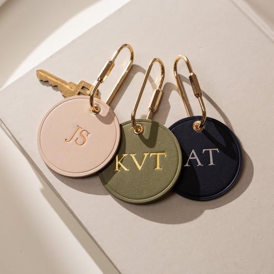 Embossed Round Circle Leather Keychain (Initials) - genuine leather, modern key rings, custom cute personalized monogrammed gift, girlfriend