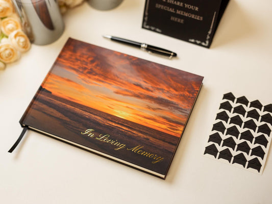 Sunset Hardcover Funeral Guest Book Set - Includes pen, photo corners, sign, box. Photo Funeral Memorial Service Condolences Memories RTS