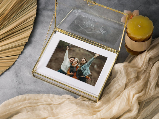 5x7" Gold Glass Photo Box - Optional Photo Mats, Picture Keepsake Box, Box for Engagement Wedding Photography, Gift for Groom Bride Couples