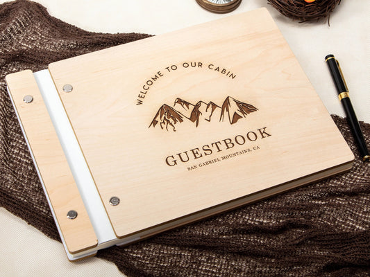 Engraved Premium Wood Guest Book with Mountain Design - Rustic Beach Cabin Guestbook Airbnb Vrbo Vacation Rental Guest Log Home Signing Book