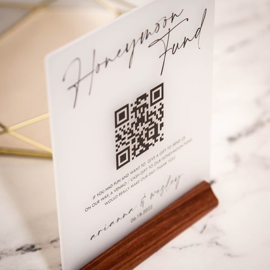 Honeymoon Fund QR Sign with Wood Stand - Scannable QR Code Acrylic Sign, Wedding Sign, Wedding Gift Table Decor, Venmo Link