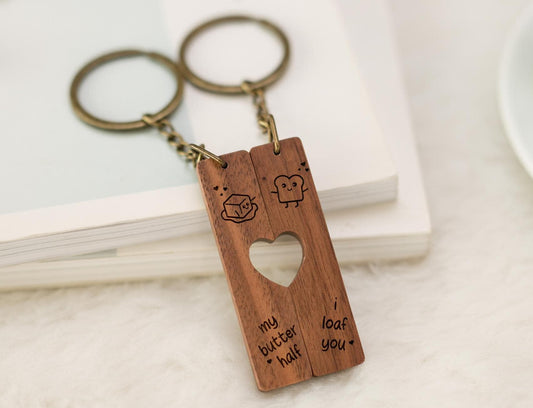 Engraved Heart Keychain Sets - I Loaf You My Butter Half Matching Set of 2 Split Heart Wooden Key Rings with Magnets, Shareable Keychains