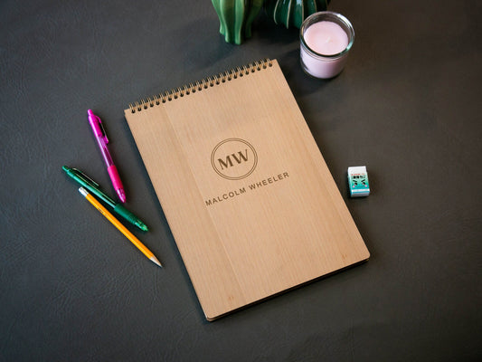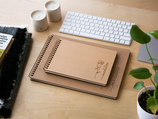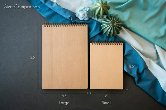 Engraved Spiral Wood Notebook (Design L) - Wooden Drawing Notepad, Artist Sketch Pad Spiral for Student, College Gift for Creatives