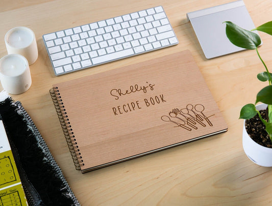 Engraved Spiral Wood Notebook (Design A) - Wooden Recipe Note Book Gift for Mom or Grandma, Chef Cook Recipes, Culinary School Student Gifts
