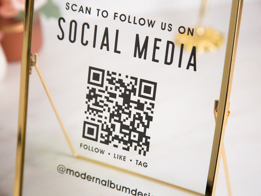 Gold Glass Social Media QR Sign - 6.5x7.75 Scan to follow Instagram Website Table Signage, Business Office Lash Salons Restaurant Trade Show
