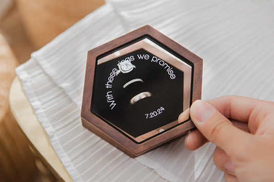 Hexagon Ring Box with Clear Acrylic Lid & Wood Base - Engraved Modern Wedding Ring Bearer Box, Engagement Proposal Ring Storage, Ring Dish