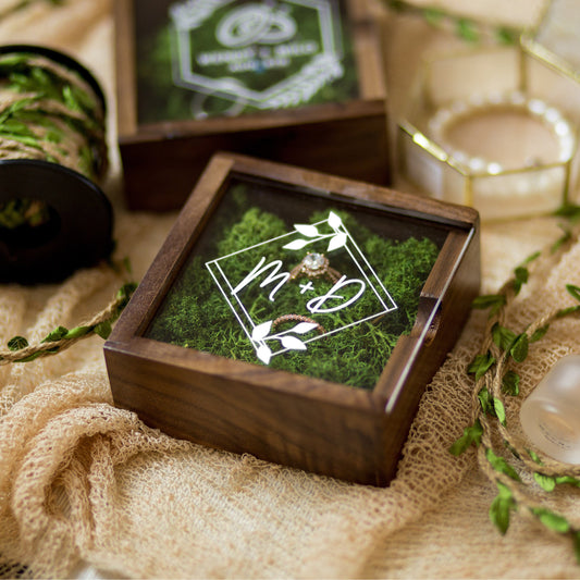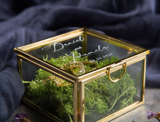 Square Gold Glass Ring Box with Moss - Personalized Ring Box for Wedding Ceremony, Modern Ring Holder for Engagements, Rustic Wedding Gift