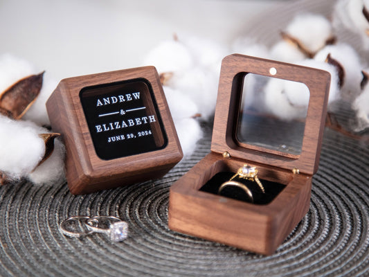 Square Double Ring Box with Glass Lid - Custom Wood Ring Bearer Box for Wedding Ceremony Proposal Engagement Anniversary Gift for Her Wife