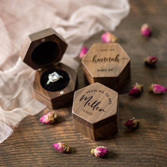 Hexagon Mini Flip Wood Ring Box - Engraved Engagement Ring Box, Single Ring Slot Storage, Proposal Box, Wedding Ring Box, Gift For Her