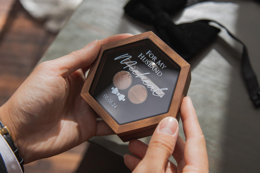 Hex Jewelry Box w/ Magnetic Glass Lid (D1) - Walnut Wood Custom Multiple Rings Slot Engagement Wedding Ceremony Ring Bearer Box Couple Gifts