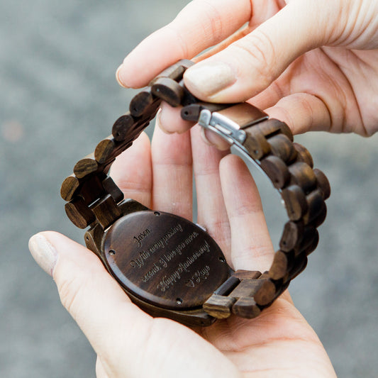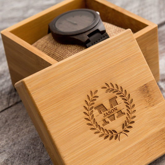 Engraved Wood Watch & Bamboo Gift Box - Mens Watch, 5th Wood Anniversary Present for Husband, Wedding Day Gift for Father of Bride Groom Son