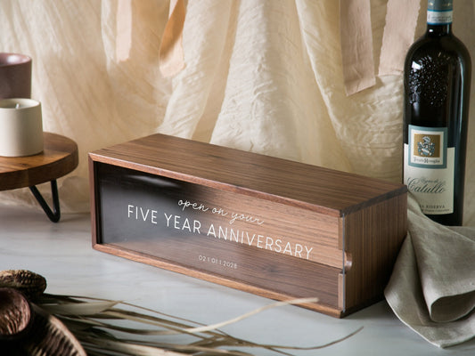 Acrylic Lid Wine Box (Design 3) - Personalized Walnut Wood Champagne Bottle Box Engagement Wedding 5th Anniversary Gift, Teacher Gift