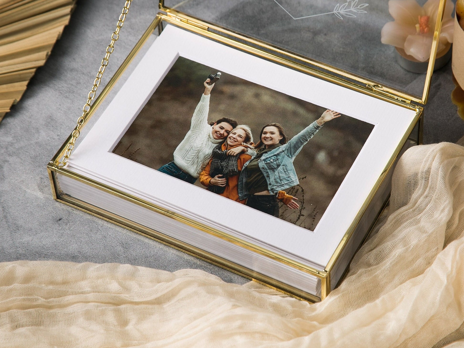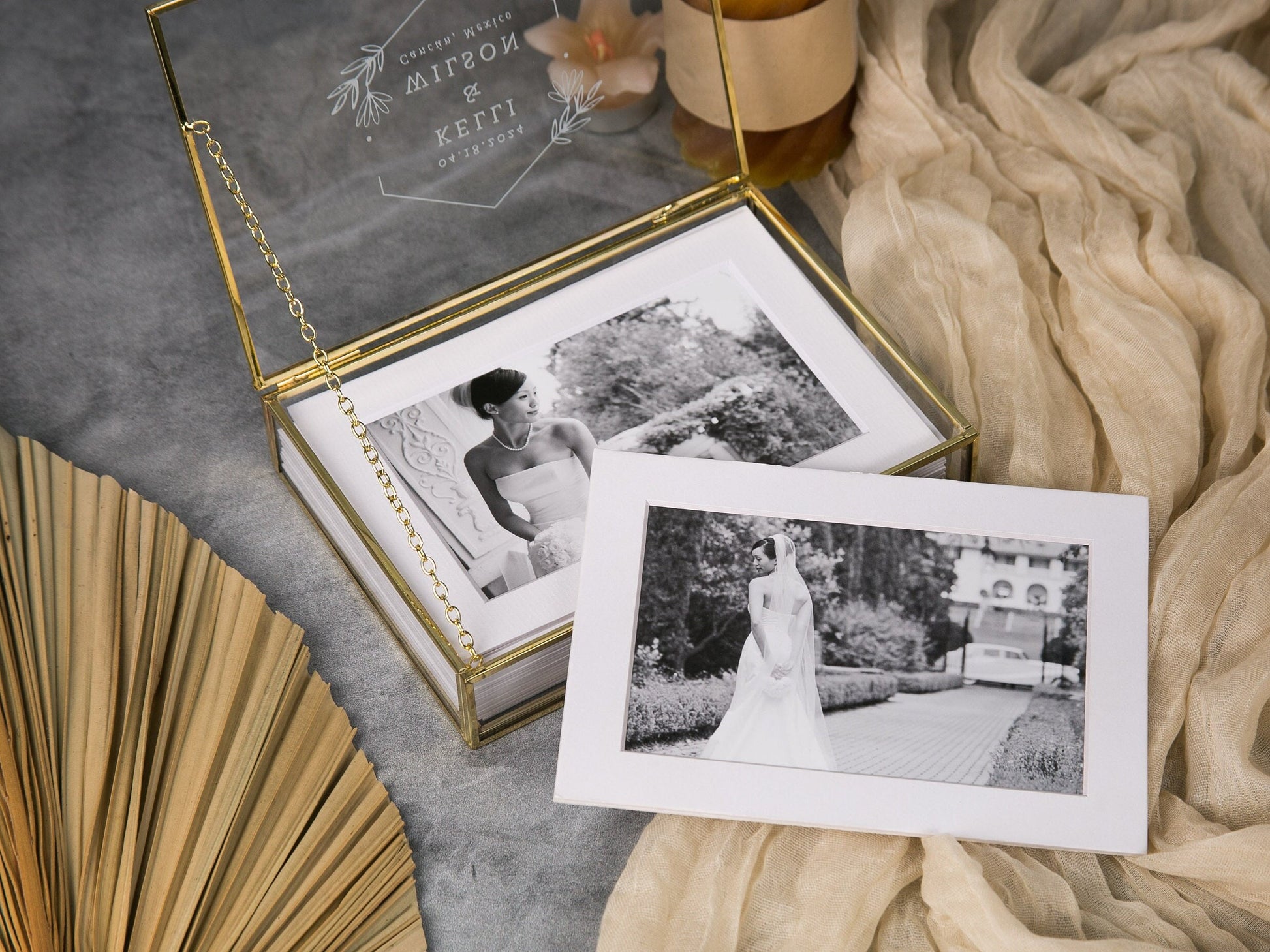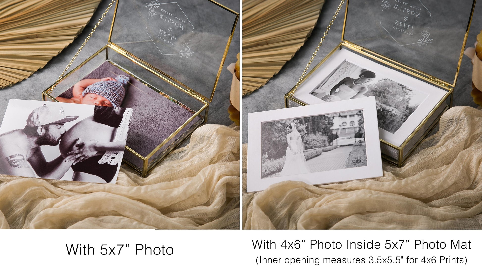 5x7" Gold Glass Photo Box - Optional Photo Mats, Picture Box, Box for Engagement Wedding Photography Gift Family Photo Box BFF Romantic Gift