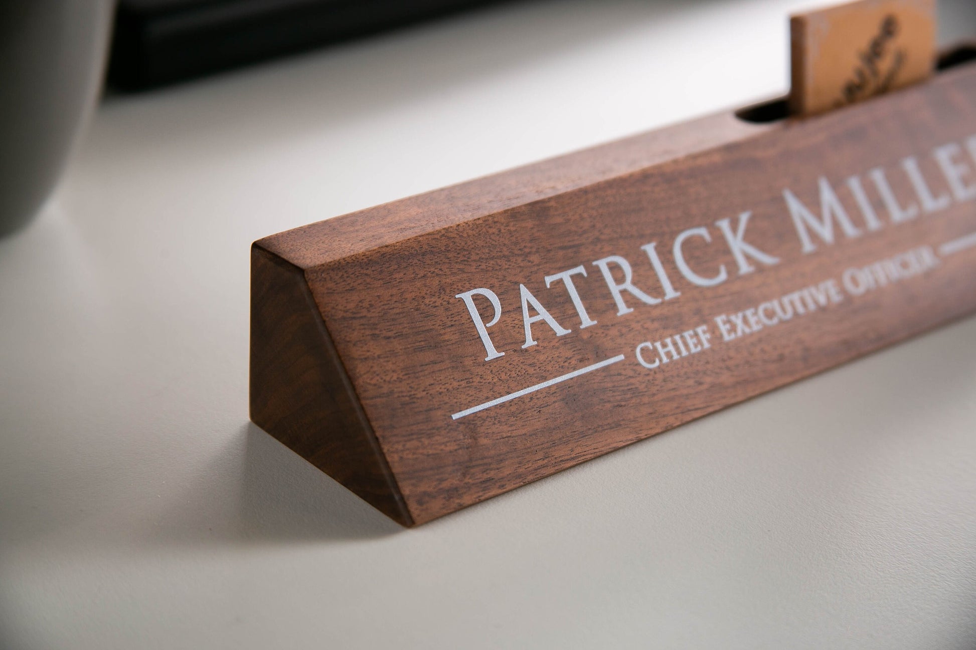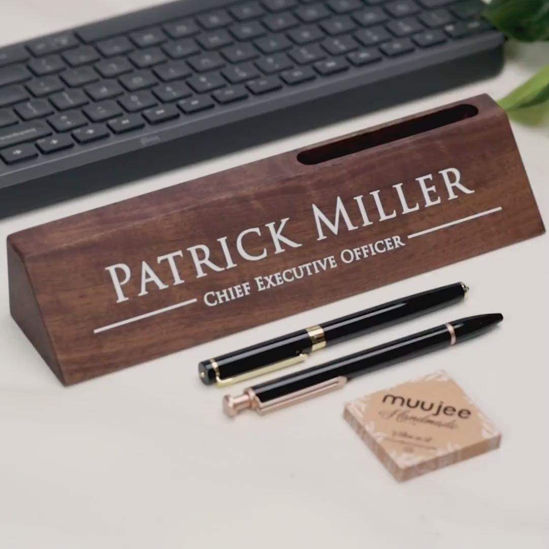 Elevate your workspace with our wooden nameplate and cardholder. Personalize it with a name or message for a thoughtful gift that's perfect for CEOs, bosses, coworkers, and professionals. Make a lasting impression with this stylish and functional desk accessory.