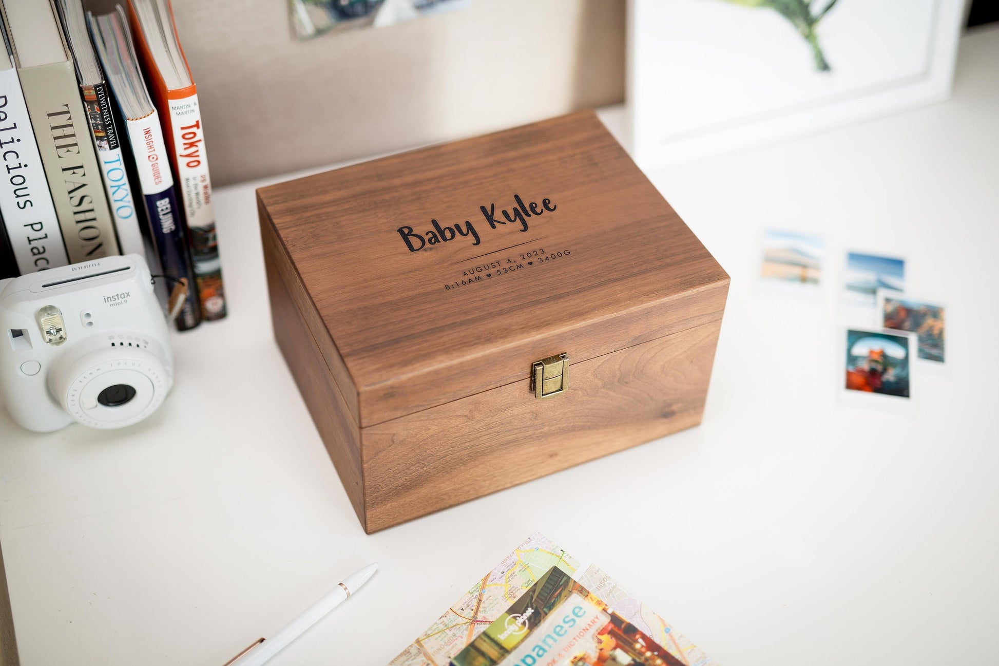 Wood Storage Box w/ Hinge Lid (D4) - Engraved Keepsake Memory Box Photos Letters Cards for Baby, New Mom and Dad Gifts, Baby Shower Card Box